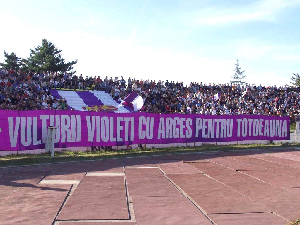 Deși este un oraș mare și cu ceva performanțe fotbalistice, Piteștiul se poate lăuda doar cu o mînă de ultrași. Galeria alb-violetă este prima din țară care și-a pus la bătaie bannerele pentru firme. Cel mai citeț steag de gard argeșean este „Vulturii Violeți“. Pe el se poate buchisi la ambele capete „Mavexim, dealer auto Dacia, tel.: 048…“ Și atît.